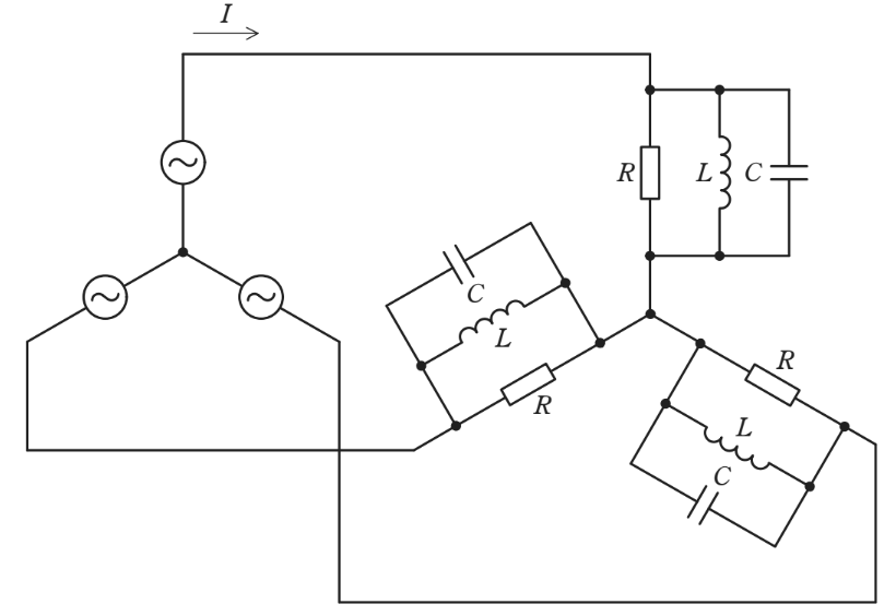 図の三相負荷はスター(Y)結線であり、各相に抵抗 $R$、コイル $L$、コンデンサ $C$ が並列に接続されています。
