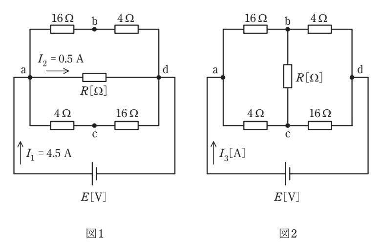 (a) 図1のように抵抗 $R \text{ [\Omega]}$ を端子 a, d 間に接続したとき、 $I_1 = 4.5 \text{ A}$、 $I_2 = 0.5 \text{ A}$ の電流が流れた。抵抗 $R$ の値 $[ \Omega ]$ として、正しいものを次の(1)~(5)のうちから一つ選べ。