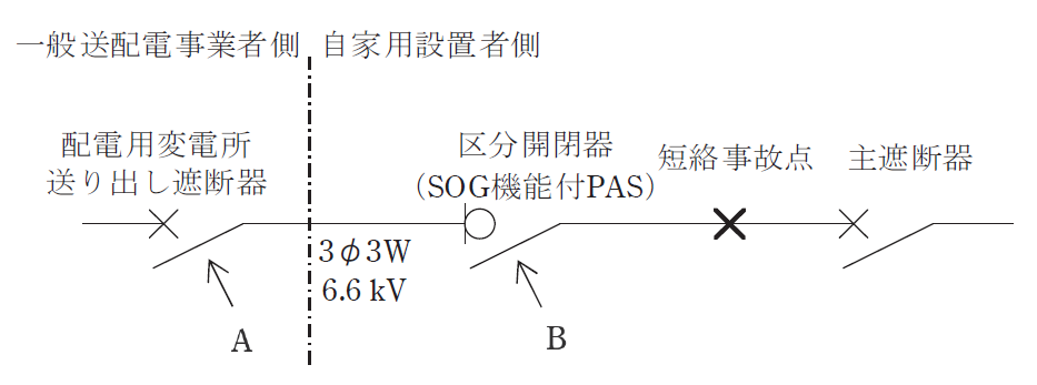 ただし、遮断器Aの配電系統及びこれに接続する全ての需要家構内に分散型電源は無いものとする。なお、本問でSOG機能付PASとは、過電流蓄勢トリップ付地絡トリップ形トリップ装置付過電流ロック形高圧気中負荷開閉器をいう。