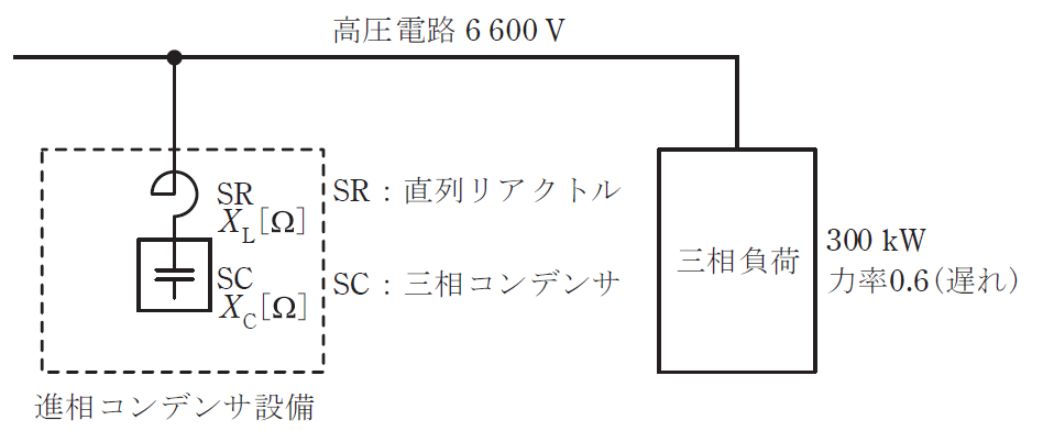 三相3線式の高圧電路に300kW、遅れ力率0.6の三相負荷が接続されている。この負荷と並列に進相コンデンサ設備を接続して力率改善を行うものとする。進相コンデンサ設備は図に示すように直列リアクトル付三相コンデンサとし、直列リアクトルSRのリアクタンス $X_L$ [Ω] は、三相コンデンサSCのリアクタンス $X_C$ [Ω] の6%とするとき、次の(a)及び(b)の問に答えよ。