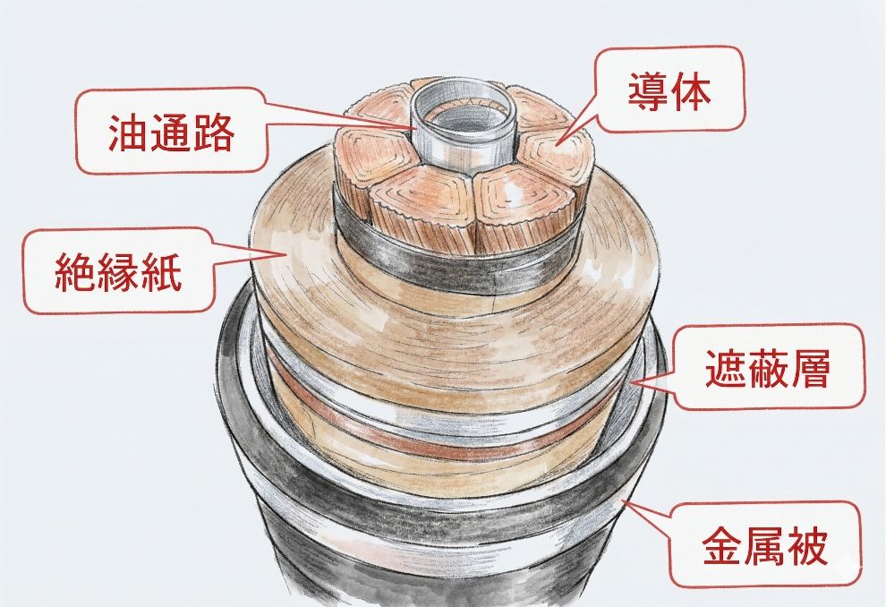 油浸紙絶縁(絶縁体が「絶縁紙」と「絶縁油」を組み合わせたもの)を用いたケーブルで「油通路が必要」です。