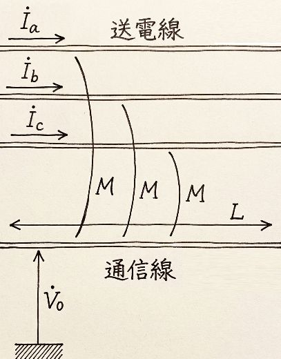 $M$:送電線と通信線間の単位長さあたりの相互インダクタンス