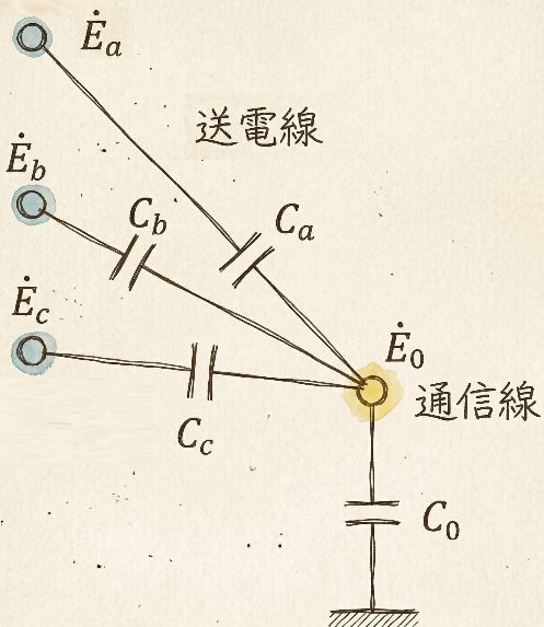 送電線(各相)から通信線へ流れる電流(各コンデンサを流れる電流)を考えます。各相と通信線の間の電位差に、各アドミッタンス ($j\omega C$) を掛けます。