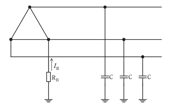図は三相3線式高圧電路に変圧器で結合された変圧器低圧側電路を示したものである。低圧側電路の一端子にはB種接地工事が施されている。この電路の一相当たりの対地静電容量を C とし接地抵抗を $R_B$ とする。