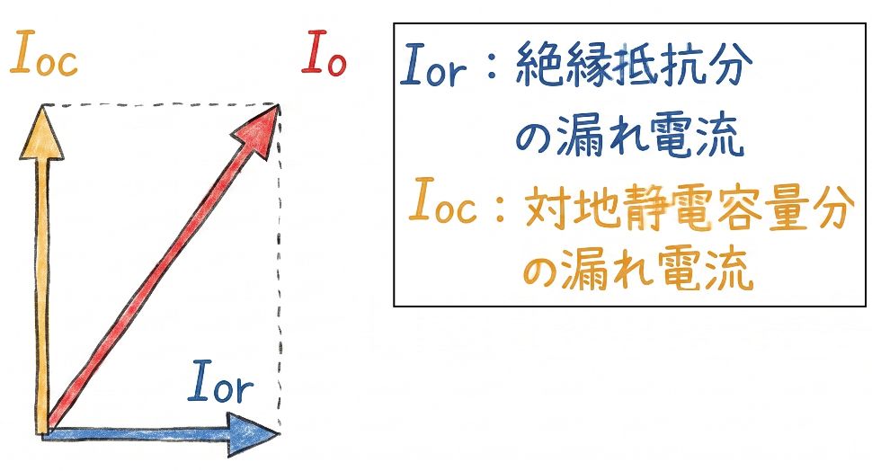 全漏れ電流($I_0=I_{0c}+I_{or}$)の中から、絶縁劣化に直結する抵抗成分の漏れ電流($I_{0r}$)のみを抽出して監視する方式です。電流だけでなく線圧も測定し、電圧位相を基準として電流の位相差を演算し、静電容量成分の影響を排除します。