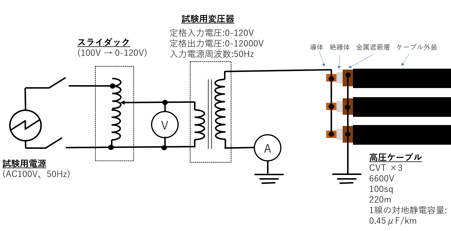 高圧ケーブルは3線一括で交流試験電圧を印加し、そのときの対地静電容量は0.2μFである。