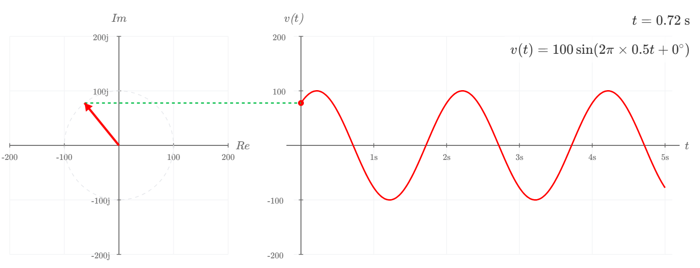 として表現したものがフェーザです。以下の図は、交流電圧波形($V_{max}=100$ 、$f=1$ 、$\theta = 0$)のフェーザ図(左)と時間軸上の波形グラフ(右)です。