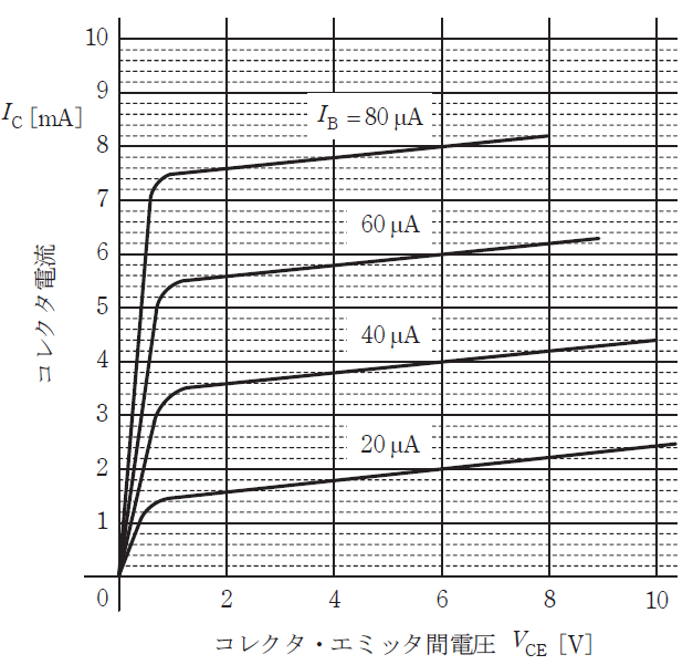 $I_B$ が $20 \mu\text{A}$ から $60 \mu\text{A}$ ($\Delta I_B = 40 \mu\text{A}$)に変化するとき、図より $I_C$ は約 $2\text{mA}$ から $6\text{mA}$ ($\Delta I_C = 4\text{mA}$)に変化します。