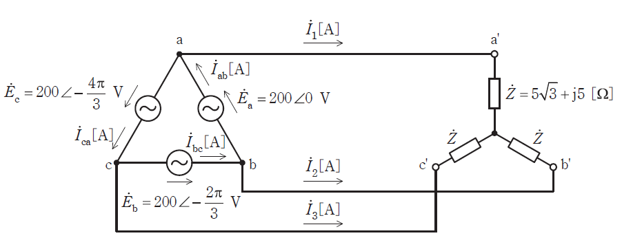 図のように、相電圧 $200\text{V}$ の対称三相交流電源に、複素インピーダンス $\dot{Z} = 5\sqrt{3} + j5 \text{ [}\Omega\text{ ]}$ の負荷が Y 結線された平衡三相負荷を接続した回路がある。次の(a)及び(b)の問に答えよ。