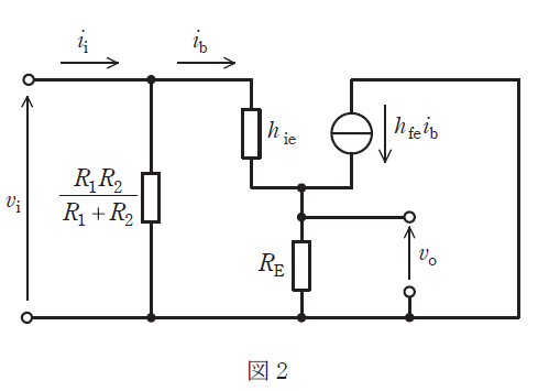 (b) 図2の交流等価回路において、 $h_{ie} = 2.5\text{k}\Omega, h_{fe} = 300$、 $R_E$ は小問(a)の値とする。入力インピーダンス $v_i / i_i \text{ [k}\Omega\text{]}$ として、最も近いものを次の(1)~(5)のうちから一つ選べ。