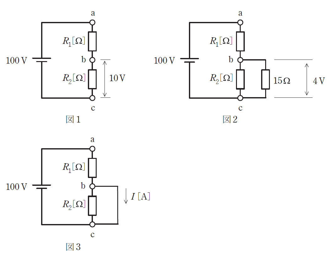 図1の直流回路において、端子a-c間に直流電圧 $100\text{V}$ を加えたところ、端子b-c間の電圧は $10\text{V}$ であった。また、図2のように端子b-c間に $15\Omega$ の抵抗を並列に追加したとき、端子b-c間の電圧は $4\text{V}$ であった。今、図3のように端子b-c間を短絡したとき、電流 $I$ の値 $\text{[A]}$ として、最も近いものを次の(1)~(5)のうちから一つ選べ。