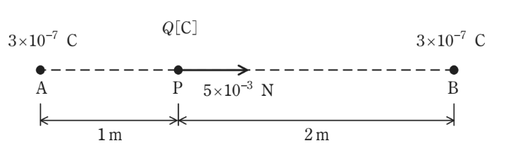 図のように、真空中の $3 \text{ [m]}$ 離れた2点A、Bにそれぞれ $3 \times 10^{-7} \text{ [C]}$ の正の点電荷がある。A点とB点とを結ぶ線分上のA点から $1 \text{ [m]}$ 離れたP点に $Q \text{ [C]}$ の正の点電荷を置いたとき、その点電荷にB点の方向に $5 \times 10^{-3} \text{ [N]}$ の力が働いた。この点電荷 $Q$ の値 $\text{[C]}$ として、最も近いものを次の(1)~(5)のうちから一つ選べ。