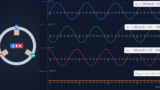 三相交流(さんそうこうりゅう)とは、位相が互いに120度($2\pi/3$ rad)ずつズレた3系統の単相交流を組み合わせた送電方式のことです。現代の電力インフラにおいて、発電所から変電所、そして工場や一般家庭の近くまで電力を運ぶための主流な方法として採用されています。三相交流の電圧は、下図(左)のように発電機内部に3つのコイルを120度の間隔で配置し、回転子(中心にあるN・Sの磁石)を回転させることで各コイルを磁束が貫き、電磁誘導によって電圧が発生します。