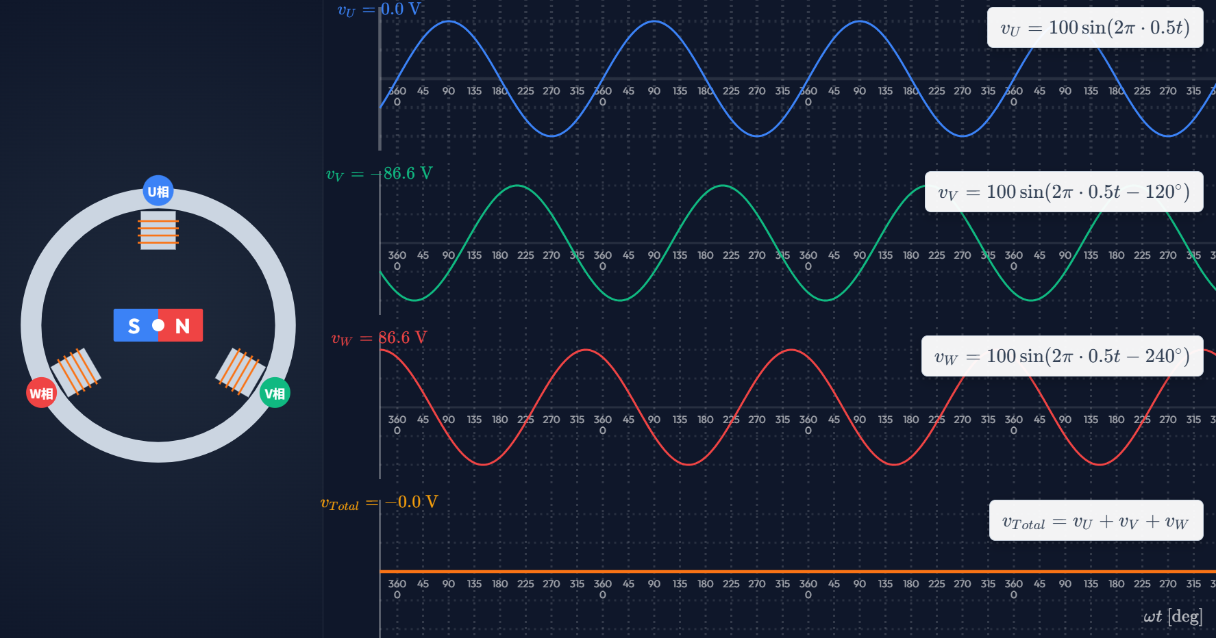 これた3つの電圧の和$v_{Total}=v_U+v_V+v_W$は、常に0になるという性質を持っています。